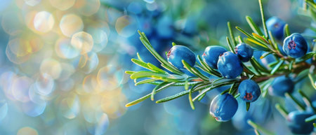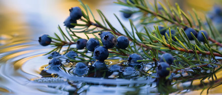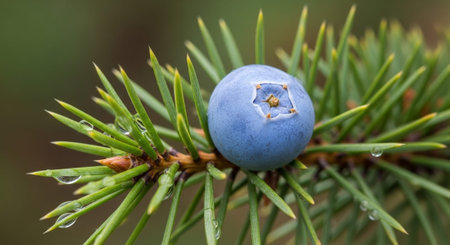 Juniper berries on a branch with dew drops close-up