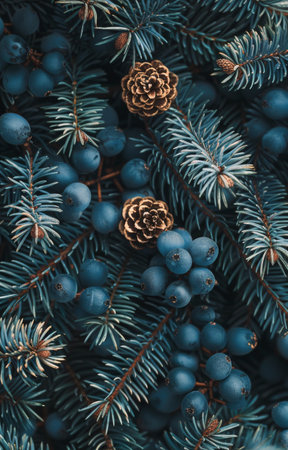 Christmas background with spruce branches and black berries. Top view.
