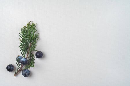 Twig of evergreen juniper with blue old berries in springtime isolated on white textured paper. Copy space. The concept of calmness, silence and unity with nature.