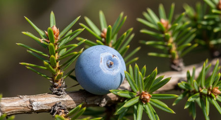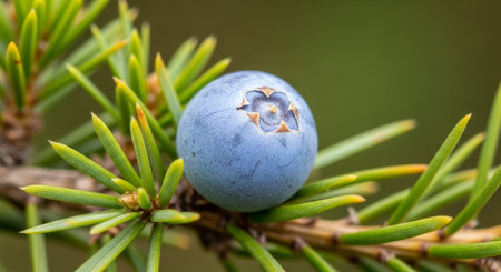 Close-up of a juniper branch with blue berries