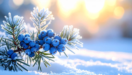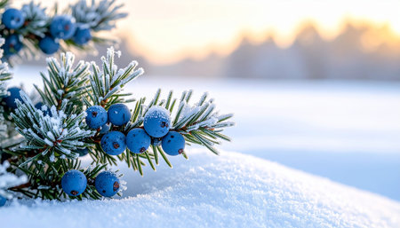 Blue berries on a branch of a Christmas tree in the snow at sunset