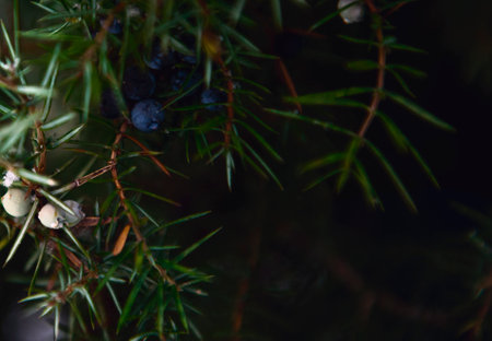 juniper branch with juniper berries on a black background. dark photo. Branches And Needles Of Juniper In Close-up. Dark Green Coniferous Background For The Design. copyspace.
