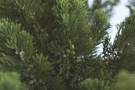 A selective focus shot of evergreen juniper tree branches