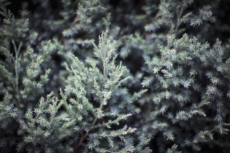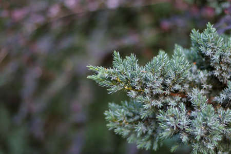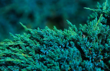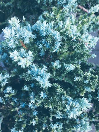 Blurred background with juniper. Green vegetation with a blue tint. Coniferous bush. Ornamental plant.