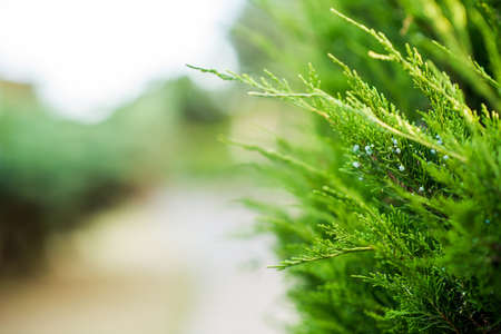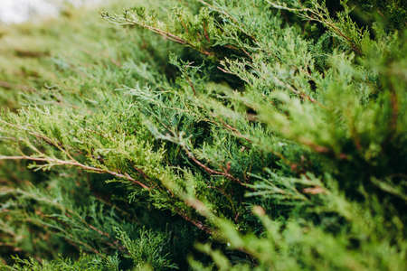 Cypress green branches in garden close up, natural green background.