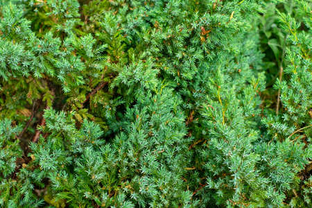 Background of the shrub of juniper at selective focus on a blurred background of other evergreen plants in summer