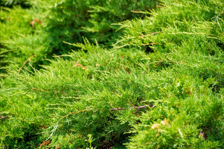 Close-up image of fresh green leaves and branches of a thriving juniper bush in natural light.