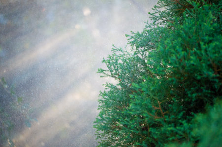 Natural freshness. The texture of a plant with raindrops. Natural green natural background. A coniferous tree species. Summer rain.