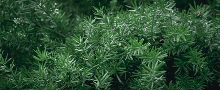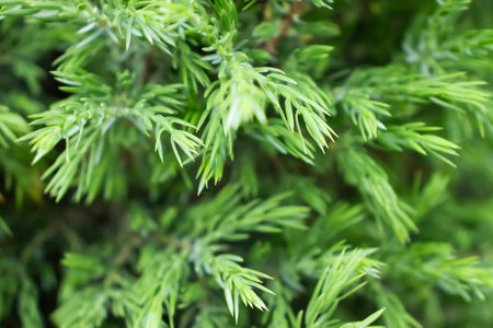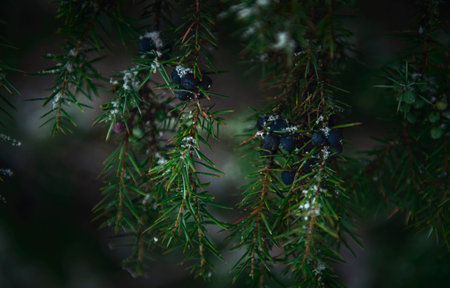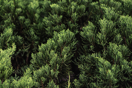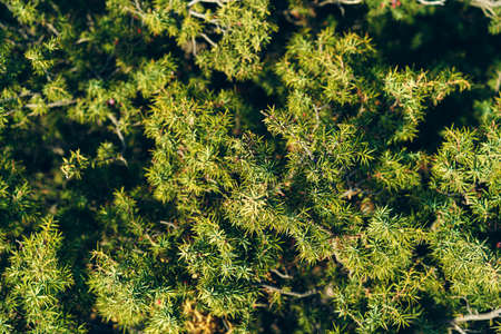 Closeup of dark green juniper bush branches with needle-like leaves and berry like cones. Mysterious wallpaper full of evergreen coniferous trees needles with focused and blurred parts