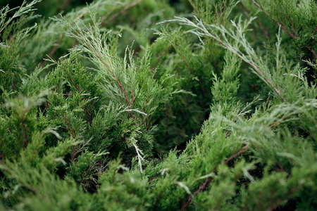 Green branches of juniper for the background. Selective focus