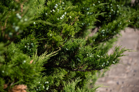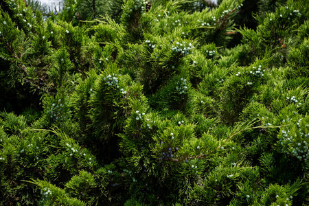 Lush green juniper branches with berries in natural sunlight.
