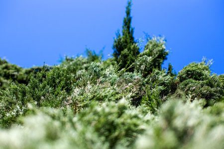 Close up of evergreen juniper tree branches on blue sky background