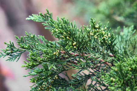 Juniper Branch. Close up View with Blurred Background. Juniper Tree Texture Background. Evergreen Coniferous Juniper Bright Green Color Surface.