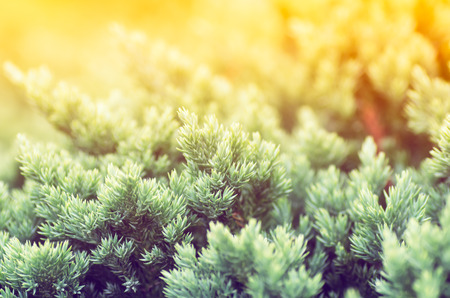 Green juniper bush branches in sunlight, background