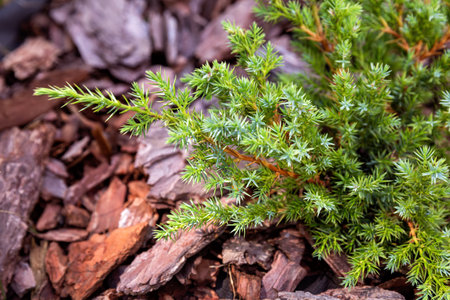 Branches of a young plant Juniperus squamata on a background of pine bark mulch