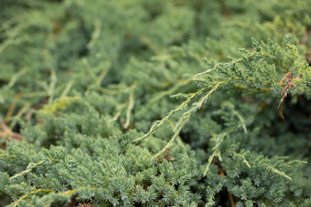 Background of the shrub of juniper at selective focus on a blurred background of other evergreen plants in summer