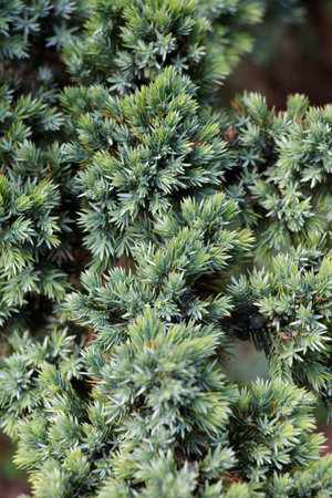 Coniferous shrubs and trees in autumn close-up. Juniper branches in the park background. Trimmed juniper bushes with blue berries. Landscape design using pine needles.