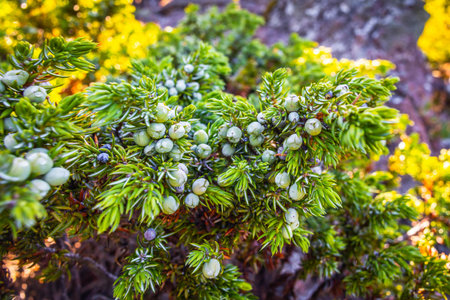 Juniper branch with berries. Juniperus communis. Evergreen thorny branches.