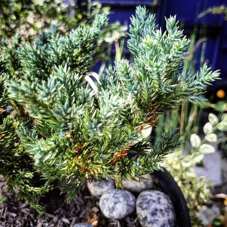 Blurred background with juniper. Green vegetation with a blue tint. Coniferous bush. Ornamental plant.