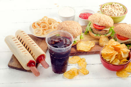 Unhealthy products. food bad for figure, skin, heart and teeth. Assortment of fast carbohydrates food with fries and cola