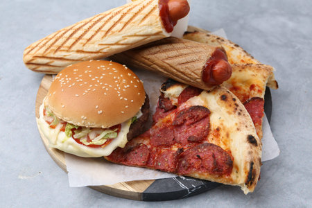 Unhealthy and junk food. Different types of fast food on the table, close up