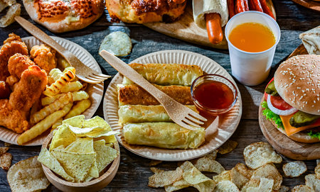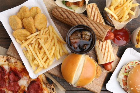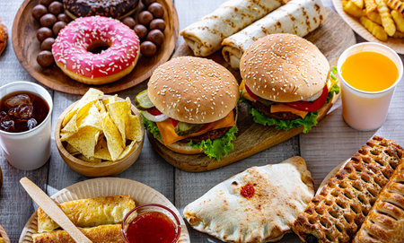 Vibrant top down illustration showcasing various fast food items including burgers, French fries, donuts, wrapped snacks, and sugary drinks, creating a tempting display of indulgent treats