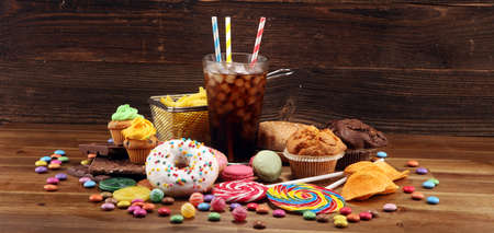 Unhealthy products. food bad for figure, skin, heart and teeth. Assortment of fast carbohydrates food and softdrink
