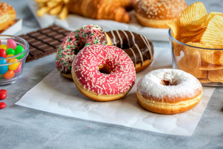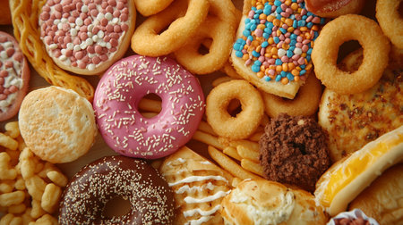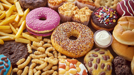 Unhealthy junk food including greasy snacks, sugary treats, and calorie-dense options.
