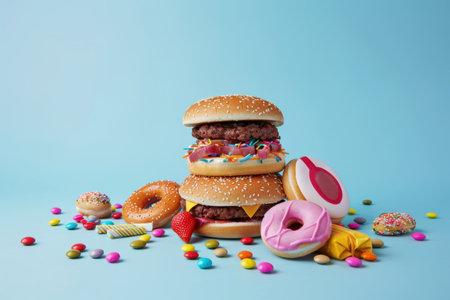 Assorted fast food items including French fries, vibrant donuts with sprinkles, and juicy burgers, are arranged on a bright turquoise surface, representing unhealthy eating and indulgence