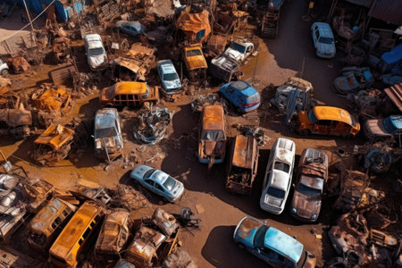 aerial view of stacked aged vehicles in junkyard, created with generative ai