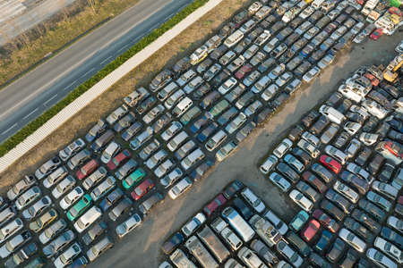 Aerial view of big parking lot of junkyard with rows of discarded broken cars. Recycling of old vehicles