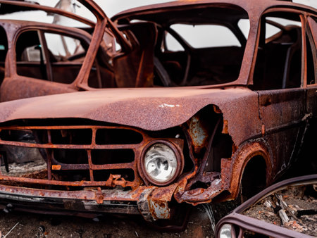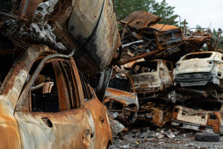 Irpin, Kyiv region, Ukraine - 28 April 2022: Car graveyard in Irpin, consequences of the invasion of the Russian army in Ukraine. Destroyed cars of civilian population.