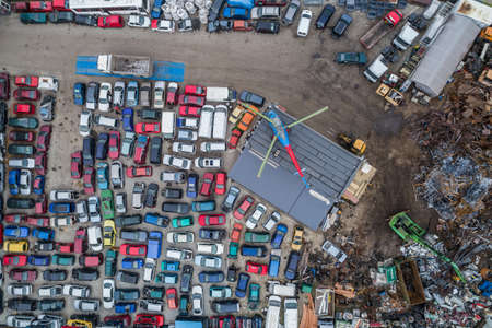 Aerial top view of industry factory of broken old cars crash from accidents. Transportation used vehicles.