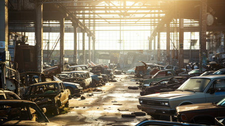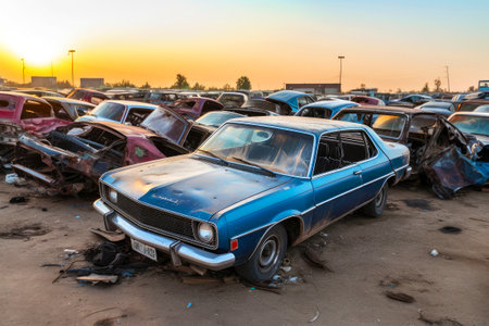 Discarded cars in a vast automotive landfill highlight the issue of environmental pollution caused by end-of-life vehicles. The need for sustainable recycling and eco-friendly disposal practices.