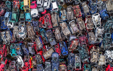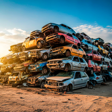 Pile of damaged vehicles stacked in a salvage yard, showcasing the lifecycle of automotive parts and the importance of recycling