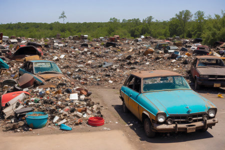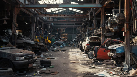 A gritty junkyard scene showcases abandoned vehicles and discarded tires, capturing the essence of urban decay and environmental neglect in a chaotic landscape.
