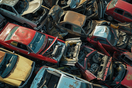 Colorful stack of decaying vintage cars in a scrapyard, reflecting rust and abandonment