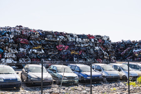 Car scrapyard with the pile of crushed and deformed cars. Oswiecim, Poland, 16 May 2022.
