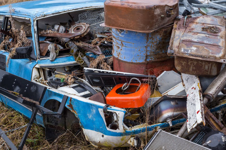 Pile of old machine parts in second hand machinery shop, background of damage and rusty old car machine