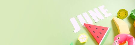 Hello, june. Exotic fruits made of paper with inflatable elements on green background. Summer concept. Holiday