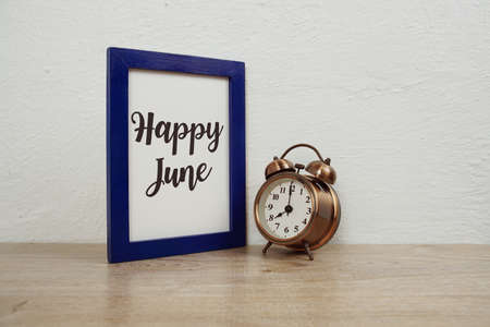 June text on grunge wooden block against handmade rag paper in blue and yellow tones, calendar concept