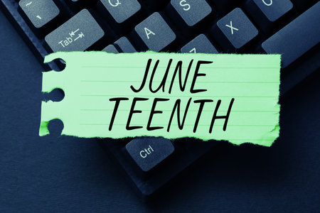 Hand writing sign June Teenth. Word Written on legal holiday in the United States in commemoration of end of slavery in the U.S