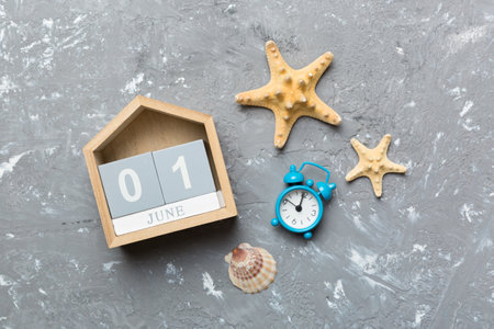 June 1st. Image of june 1 wooden calendar on colored background. summer day. Empty space for text.