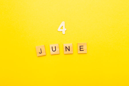 Top view of word 4 June calendar date made by wooden cubes on yellow color background