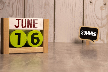 Calendar for June 16, made wooden cubes, on gray background.With an empty space for your text