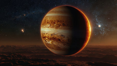 A stunning cosmic landscape featuring Jupiter in starry space