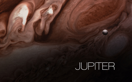 Jupiter and a nearby moon float amidst a starry universe, illustrating the vastness of space and celestial bodies.