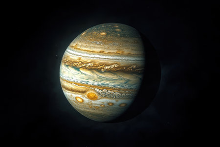 Jupiter showcases its distinct swirling bands and Great Red Spot, floating majestically in space.