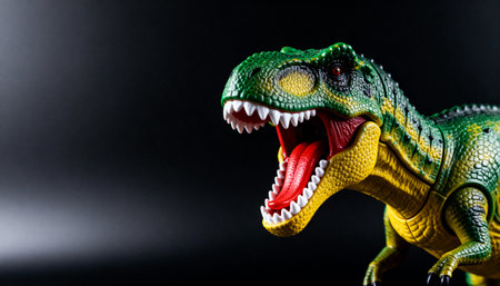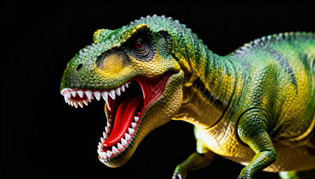 A detailed close-up of a green and yellow Tyrannosaurus Rex toy. The dinosaurs mouth is open in a roar, displaying sharp teeth, set against a solid black background.