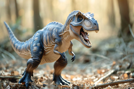Tyrannosaurus rex dinosaur toy in the forest at sunset